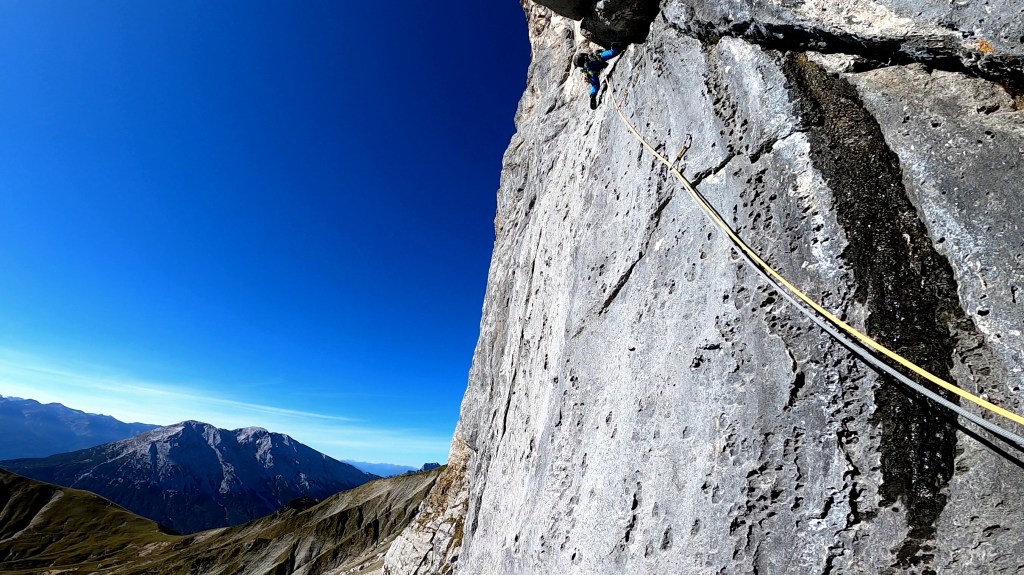 Im extremen Fels oder doch eher extrem Plaisir? Die direkte Südwand an der Schüsselkarspitze im Wetterstein bietet bei moderater Schwierigkeit traumhafte steile Kletterei vor einer fantastischen Kulisse. Fast könnte man meinen, man klettert einen „Geheimtipp“ und nicht einen Pauseklassiker. Anstatt poliertem Marmor, wie in vielen Pausetouren andernorts, gibt es hier noch rauen, griffigen Fels. Bei der durchgehend soliden Sicherung mit Klebeborhaken – bis auf die leichten Ein- und Ausstiegsseillängen -, hätten die Cams eigentlich fast zu Hause bleiben können. Und dass, obwohl die tollen Risse diese praktisch überall bereitwillig aufgenommen hätten. Aber warum nicht auch mal extrem Plaisir und sich dabei die warme Herbstsonne ins Gesicht scheinen lassen? Eine absolute Empfehlung!