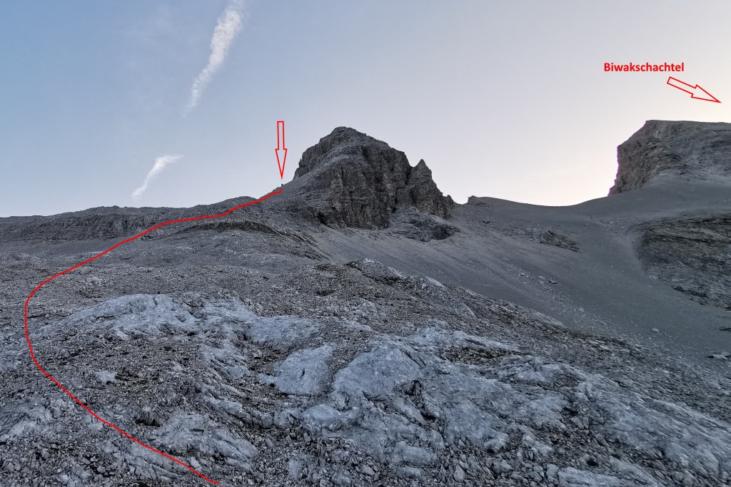 Am Gipfel in Richtung Westen (Herzogkante) wenden, Steigspuren folgend erst ins flachere Gelände absteigen und dort bis zur Biwakschachtel die Hänge queren (ca. 30 Minuten). Die Biwakschachtel ist komfortabel ausgestattet und sollte unbedingt genutzt werden, wenn für den Abstieg durch die Spindlerschlucht nicht mehr ausreichend Tageslicht zur Verfügung steht (von hier zur Sicherheit bis zur Falkenhütte 3,5 – 4 Stunden einplanen).