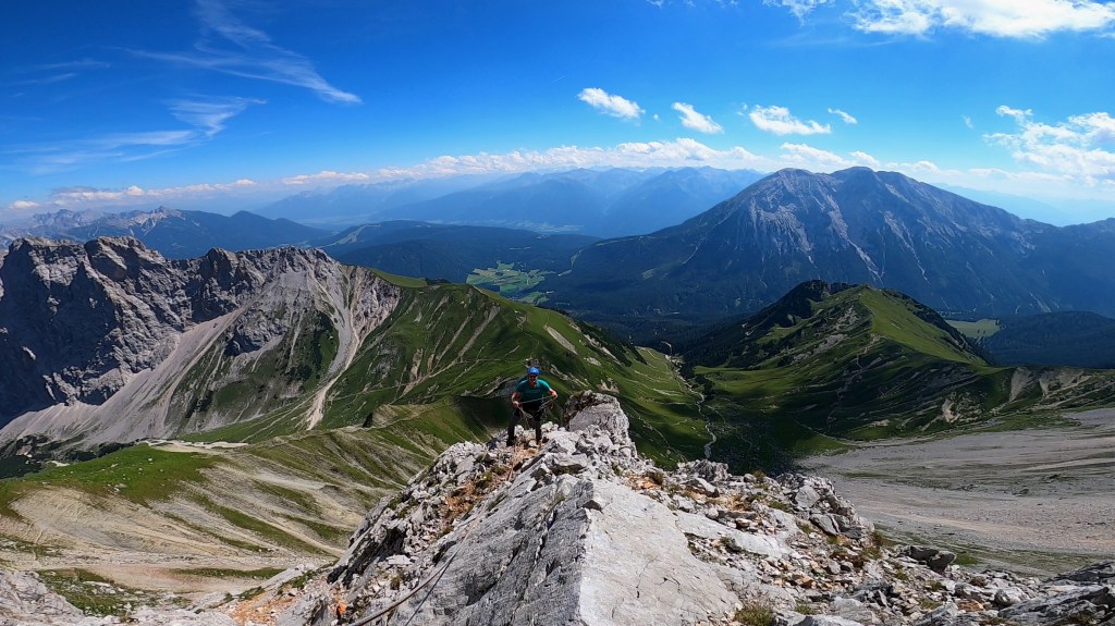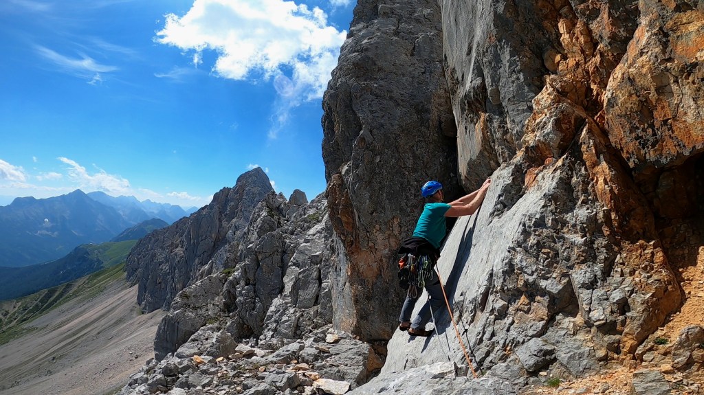 Die Scharnitzspitze – Direkte Südwand, welche 1957 von W. Spitzenstätter und H. Baldauf erstbegengen wurde, führt aus dem malerischen Schüsselkar hinauf auf den höchsten der drei Gipfel der Scharnitzspitze. Wenn auch Teil des Auswahlführers „Im extremen Fels“, so ist die Tour heute dank gemäßigtem Schwierigkeitsgrad und Sanierung mit Bohrhaken eine echte Plaisirtour.