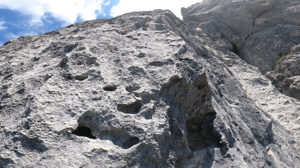 SL1 (7+): Die Tour startet mit der anspruchsvollsten SL. Vom Start weg, darf hier in der senkrechten, kompakten Wand an Löchern und Leisten gleich ganz ordentlich angezogen werden. SL2 (7-): Die Wand neigt sich etwas zurück. Die Kletterei bleibt für den Schwierigkeitsgrad jedoch anspruchsvoll. SL3 (2): Vom zweiten Stand weg kriecht man nach links durch die ausgeschnittenen Latschen auf und hinweg über den Kopf des Vorbaus zur Wand. SL4 (7): Zunächst in der Verschneidung neben einem lehnenden Pfeiler, geht es von dessen Kopf technisch, delikat über eine Platte, die sich jedoch sehr schön auflöst. SL5 (5+): Entlang einer Rissverschneidung auf einen Pfeilerkopf. SL6 (6): Vom Pfeilerkopf den Rücken weiter hinauf. Zwischen zwei „Blöcken“, die eine Verschneidung bilden, die rechte, steilere Variante nach rechts auf einen Grasabsatz. Hier ist die Orientierung nicht ganz easy, da sich zwei Touren kreuzen und nach rechts (Richtung große Verschneidung, die zum Gipfel hinaufzieht) kein Borhaken mehr kommt. Lässt sich mit ein, zwei kleinen/mittleren Cams jedoch gut absichern. SL7 (6+): Vom Stand auf dem Grasfleck bieten sich wiederum mehrere Varianten. Nicht nach rechts den zwei Touren in die große Verschneidung folgen, sondern direkt links, die für den Grad viel zu steil und schwer aussehende Kante hinauf. Der Fels ist durchlöchert wie ein Schweizer Käse. Es erwartet Euch grandiose, steile, exponierte Kletterei an super Henkeln. Genial! SL8 (6): Die Kante hinauf bis zum Gipfel.