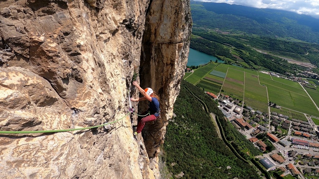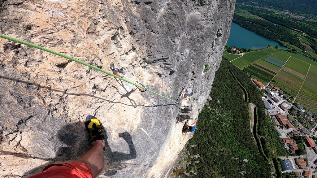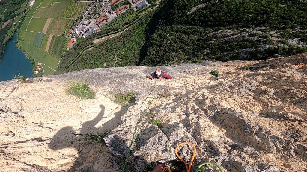 Jedes Mal, wenn man von Norden aus ins Sarcatal hinabfährt, ist sie die erste große Wand, an der die Blicke hängen bleiben. Die Südwand des Piccolo Dain. Wie oft saßen wir schon unten bei der Eisdiele und haben zu diesem gelb-grauen Dreieck hinaufgeschaut, wie oft im Führer geblättert und wieder festgestellt, dass alle Touren durch die Wand entweder technische Kletterei, oder aber hohe Freikletter-Schwierigkeiten erfordern. Entschieden haben wir uns letztlich aufgrund der historischen Bedeutung für die „Scirocco“. 1988 von Rolando Lacher und Gef. erstbegangen, war sie die erst zweite Tour Italiens, die in freier Kletterei von unten mit dem Bohrmeißel eingebohrt wurde. Eine wirklich herausragende Tour, welche sich in direkter Linie und anhaltender Schwierigkeit ihren Weg durch den gelben, kompakten Fels der Südwand sucht. Nachdem die Route zuletzt saniert und durchgängig mit 10mm Bohrhaken ausgestattet wurde, ist sie uneingeschränkt zu empfehlen.