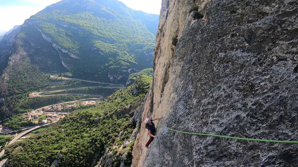 SL5 (6c+): Nach einer kurzen steilen Rissverschneidung, neigt sich die Wand ein wenig nach hinten. Wer sich auf eine „leichte Seillänge“ zum entspannen gefreut hat, stellt fest, dass hier plötzlich die Hakenabstände deutlich weiter werden und der aufgerufene Grad hier zwischen den 5 m auseinander liegenden Haken geklettert werden mag. SL6 (7a): Vom Stand nach rechts über einen kleinen Überhang. Der Abstand vom 1. zum 2. Zwischenhaken sieht weit aus (ist es auch:-), löst sich aber gut auf. Danach weiterhin homogene Wandkletterei um 6c, bevor am Schluss zum Absatz nochmal zwingend an guten Leisten, in weiten Zügen motiviert zugepackt und über den Haken gestiegen werden darf (7a+).