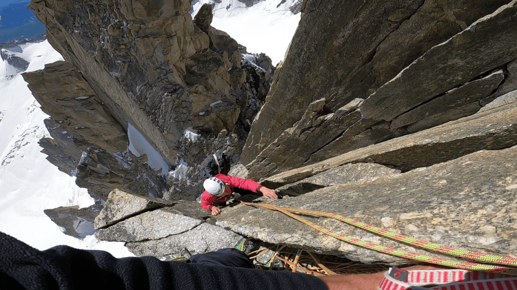 Aus der Scharte über eine Platte (5+) in 1-2 SL auf der Gratschneide hinauf auf den Pointe Chaubert 4.074 m. Auf dessen Rückseite an gebohrten Abseilständen 2-3 x in die Scharte abseilen und über leichtes Gelände zum nächsten Turm.