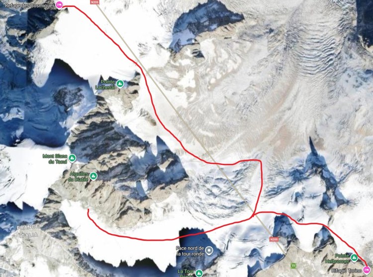 Der Zustieg von der Cosmiques-Hütte auf 3.600 m ist sowohl von der Strecke, als auch der Höhendifferenz (400 hm ab, 400 hm auf) deutlich länger und benötigt ca. 3,5 Stunden. Vorgelagert vor der Pyramide du Tacul / dem Grand Capucin liegt eine extrem spaltenreiche Zone des Gletschers, welche weitläufig nach Südost umgangen / durchquert wird. Dieser Zustieg sollte daher nur bei adäquaten Bedingungen und vorhandener Spur gewählt werden. Ohne Sicht (Nacht/Nebel) und ohne gute Spur (direkt nach Neuschneefällen), möchte man sich in diesem Labyrinth aus riesigen Spalten in keinem Fall verirren.